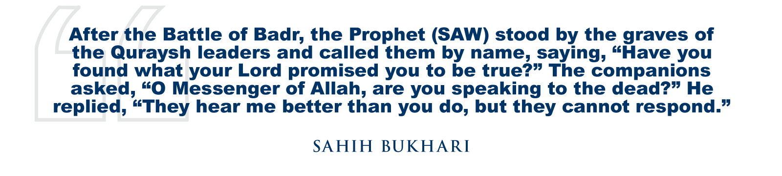 After the Battle of Badr, the Prophet (SAW) stood by the graves of the Quraysh leaders and called them by name, saying, “Have you found what your Lord promised you to be true?” The companions asked, “O Messenger of Allah, are you speaking to the dead?” He replied, “They hear me better than you do, but they cannot respond.” (Sahih Bukhari)