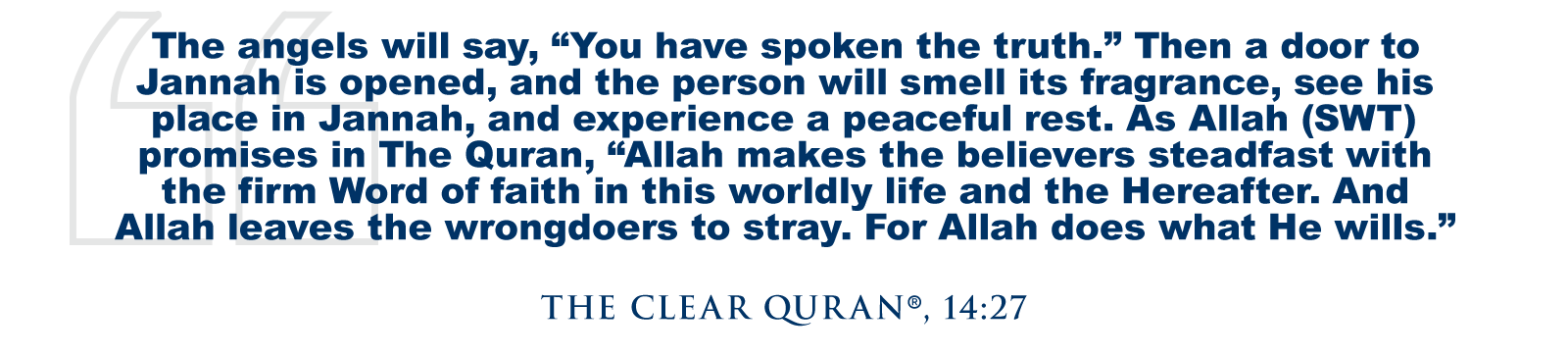 The angels will say, “You have spoken the truth.” Then a door to Jannah is opened, and the person will smell its fragrance, see his place in Jannah, and experience a peaceful rest. As Allah (SWT) promises in The Quran, “Allah makes the believers steadfast with the firm Word of faith in this worldly life and the Hereafter. And Allah leaves the wrongdoers to stray. For Allah does what He wills.” (The Clear Quran®, 14:27)