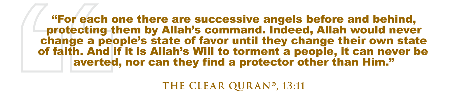 Allah (SWT) tells us in The Quran, “For each one there are successive angels before and behind, protecting them by Allah’s command. Indeed, Allah would never change a people’s state of favor until they change their own state of faith. And if it is Allah’s Will to torment a people, it can never be averted, nor can they find a protector other than Him.” (The Clear Quran®, 13:11)