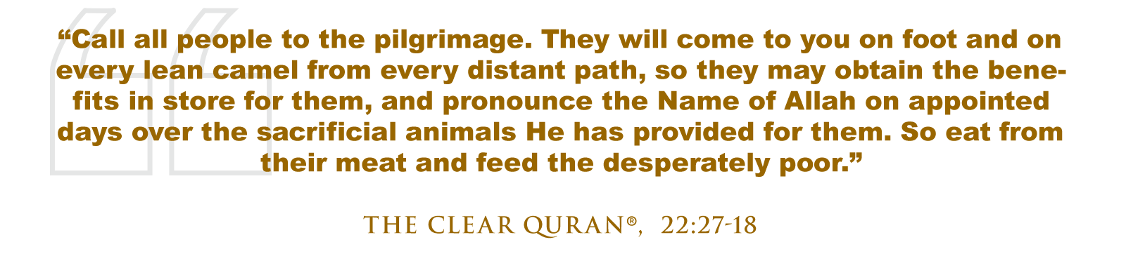Allah (SWT) says, “Call all people to the pilgrimage. They will come to you on foot and on every lean camel from every distant path, so they may obtain the benefits in store for them, and pronounce the Name of Allah on appointed days over the sacrificial animals He has provided for them. So eat from their meat and feed the desperately poor.” (The Clear Quran®, 22:27-18)