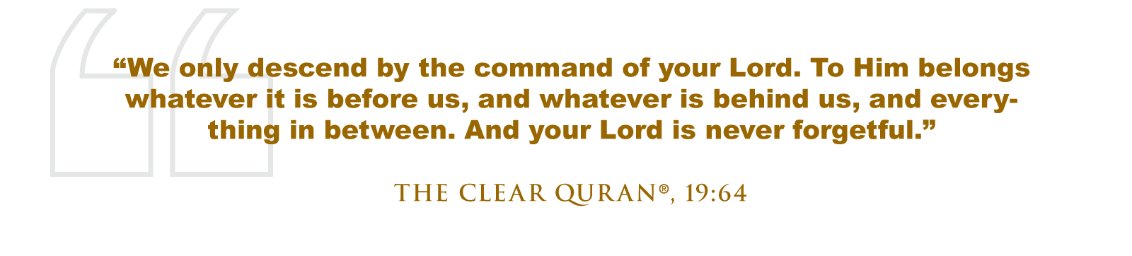 Allah (SWT) says, “We only descend by the command of your Lord. To Him belongs whatever it is before us, and whatever is behind us, and everything in between. And your Lord is never forgetful.” (The Clear Quran®, 19:64)