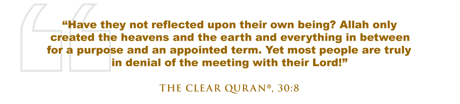 Allah (SWT) says in The Quran, “Have they not reflected upon their own being? Allah only created the heavens and the earth and everything in between for a purpose and an appointed term. Yet most people are truly in denial of the meeting with their Lord!” (The Clear Quran®, 30:8)
