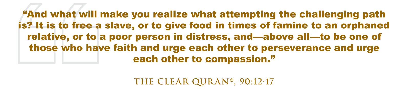 Allah (SWT) said, “And what will make you realize what attempting the challenging path is? It is to free a slave, or to give food in times of famine to an orphaned relative, or to a poor person in distress, and—above all—to be one of those who have faith and urge each other to perseverance and urge each other to compassion.” (The Clear Quran®, 90:12-17)