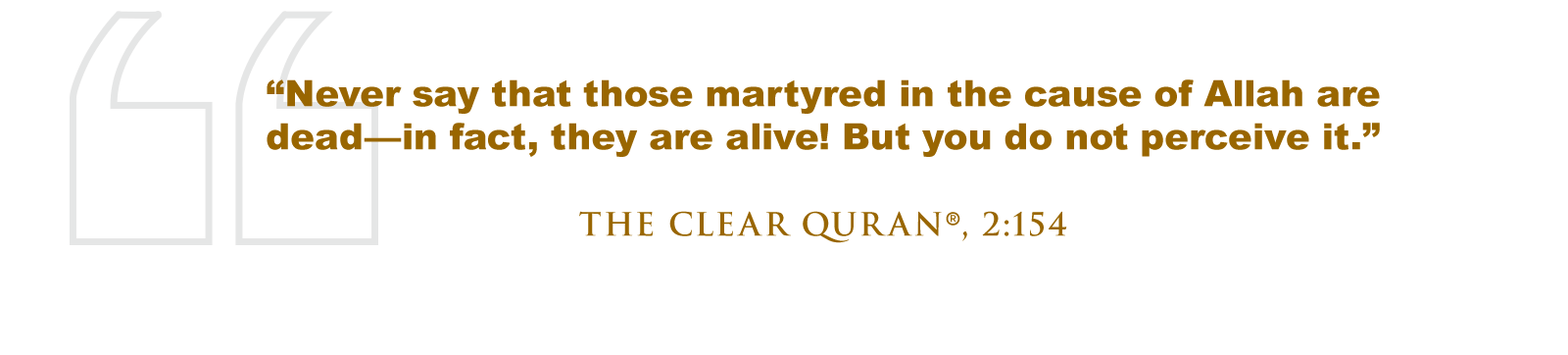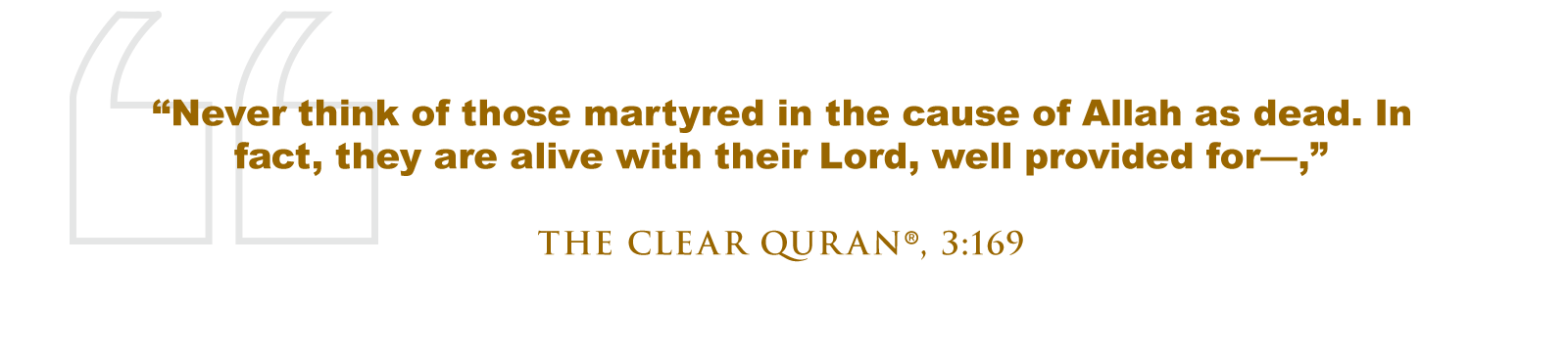 Allah (SWT) says in The Quran, “Never say that those martyred in the cause of Allah are dead—in fact, they are alive! But you do not perceive it.” (The Clear Quran®, 2:154)