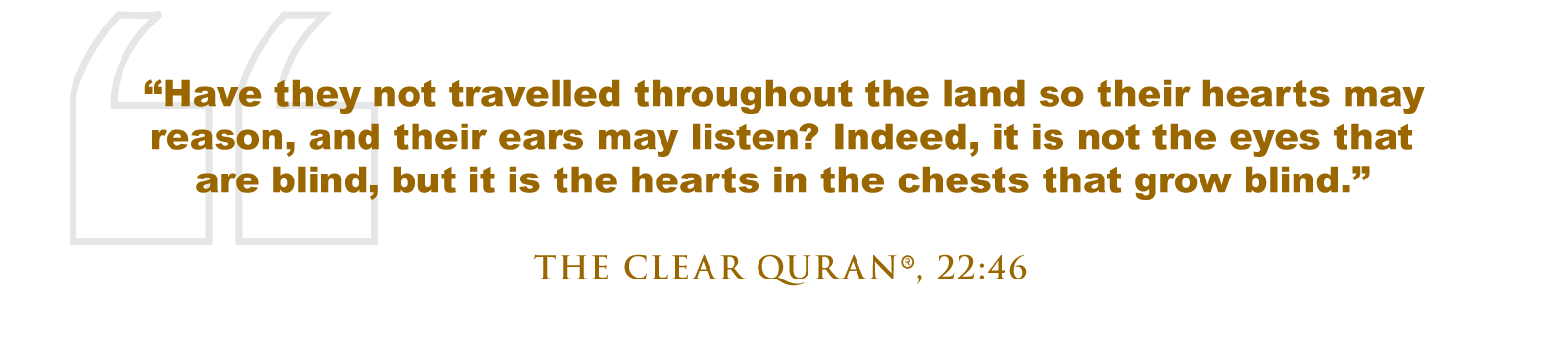 Allah (SWT) says, “Have they not travelled throughout the land so their hearts may reason, and their ears may listen? Indeed, it is not the eyes that are blind, but it is the hearts in the chests that grow blind.” (The Clear Quran®, 22:46)