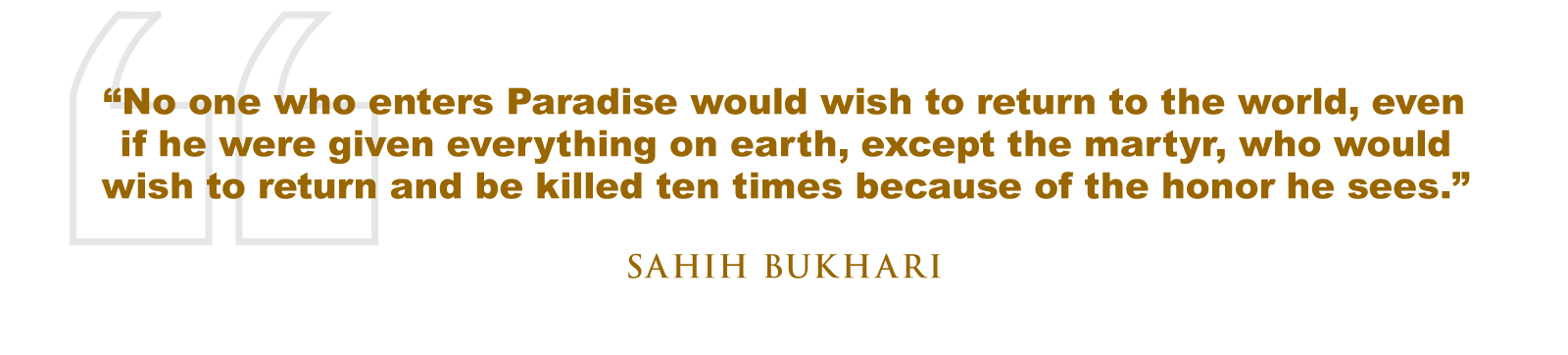 In an authentic hadith he (SAW) says, “No one who enters Paradise would wish to return to the world, even if he were given everything on earth, except the martyr, who would wish to return and be killed ten times because of the honor he sees.” (Sahih Bukhari)