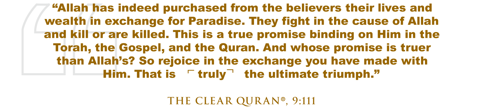 Allah (SWT) says in The Quran, “Allah has indeed purchased from the believers their lives and wealth in exchange for Paradise. They fight in the cause of Allah and kill or are killed. This is a true promise binding on Him in the Torah, the Gospel, and the Quran. And whose promise is truer than Allah’s? So rejoice in the exchange you have made with Him. That is ˹truly˺ the ultimate triumph.” (The Clear Quran®, 9:111)