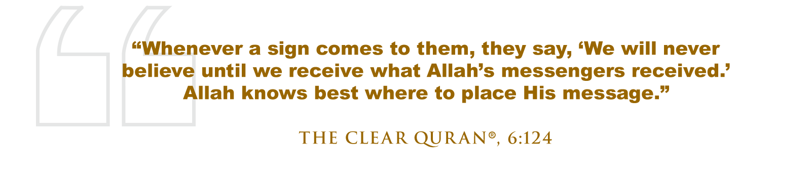 Allah (SWT) says in The Quran, “Whenever a sign comes to them, they say, ‘We will never believe until we receive what Allah’s messengers received.’ Allah knows best where to place His message.” (The Clear Quran®, 6:124)