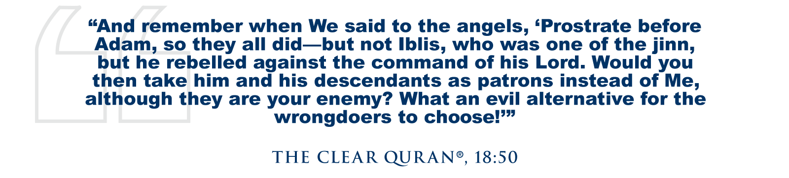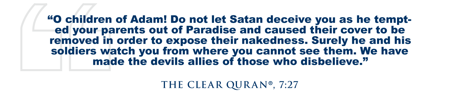 Iblis and his followers have dedicated themselves to misleading mankind. The Quran warns, “O children of Adam! Do not let Satan deceive you as he tempted your parents out of Paradise and caused their cover to be removed in order to expose their nakedness. Surely he and his soldiers watch you from where you cannot see them. We have made the devils allies of those who disbelieve.” (The Clear Quran®, 7:27)